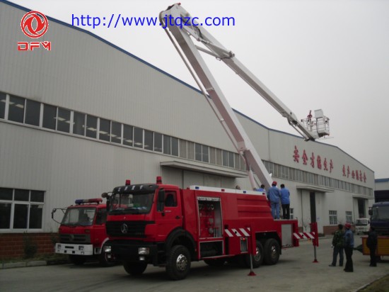 豪濼26米舉高噴射消防車是采用重汽原裝二類消防車專用底盤ZZ1257N4647C基礎之上加舉高機構、液壓旋轉機構、消防炮、消防泵及罐體、器材箱等改裝而成,配有中低壓消防泵,具有向高層建筑噴水滅火和高層供水,是專職消防隊、石油化工必備的消防車輛。
