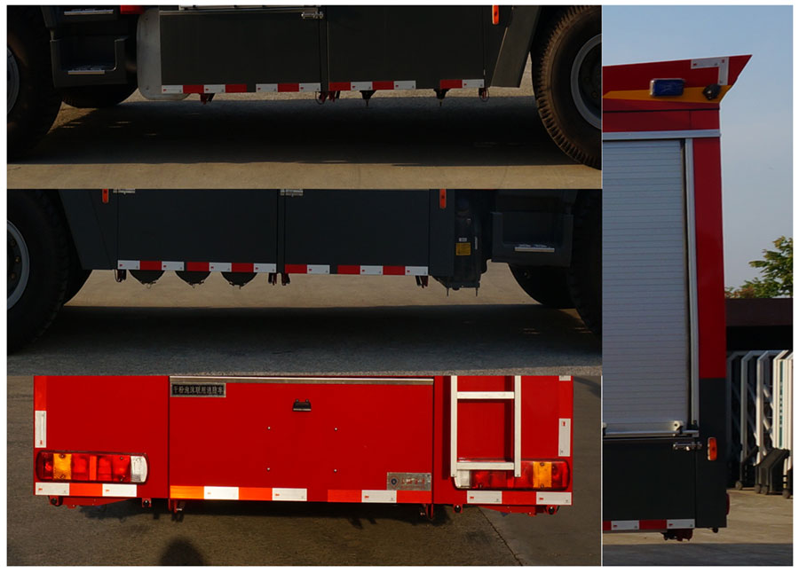 整車備注:罐體總容積為11.447立方米,水罐容積:5.355立方米,水罐尺寸:1570×2350×1520mm,泡沫液罐容積:2.892立方米,泡沫液罐尺寸:850×2350×1520mm,干粉罐容積:3.2立方米(直徑×高):1510×1860mm。整體式側后防護結構,后防護離地高度:496mm。后伸:170 mm。ABS生產企業為威伯科汽車控制系統(中國)有限公司,型號為4460046300。主要專用裝置有消防泵、消防炮、干粉系統